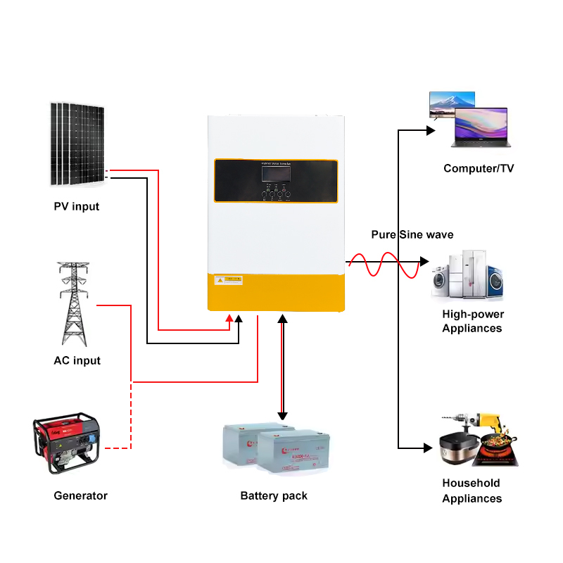 | Tipe inverter | Inverter Solar Hibrida | Tipe output | Gelombang sinus tunggal dan murni |